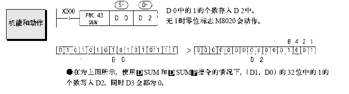 三菱的ON位數(shù)統(tǒng)計指令SUM (D)SUM(P)指令,該指令是用來統(tǒng)計指定元件中1的個數(shù)。如圖4所示,當X0有效時執(zhí)行SUM指令,將源操作數(shù)D0中1的個數(shù)送入目標操作數(shù)[D2中,若D0中沒有1,則零標志M8020將置1。