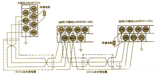 1)CC-Link專用電纜連接。用CC-Link專用電纜連接模塊,兩端加終端電機(jī),如下圖所示。在連接前一定要斷開(kāi)電源。