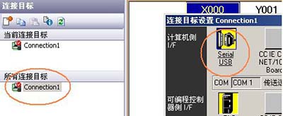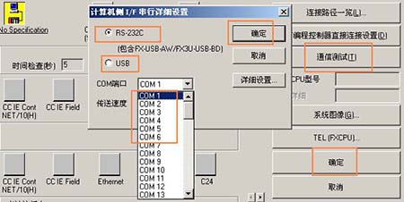 編程電纜插傳統(tǒng)的圓孔時,連接目標設置選擇 RS-232C,并且要選擇相應的 COM 口編程電纜插迷你 USB 口時,連接目標設置選擇 USB。